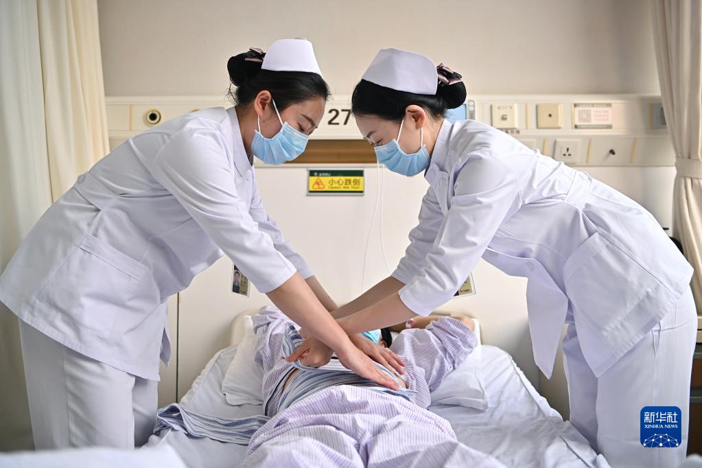 5月11日6時(shí)許,北京協(xié)和醫院基本外科四病房護士李婷(左)和李美宣(右)晨間護理時(shí)一起為患者打腹帶。