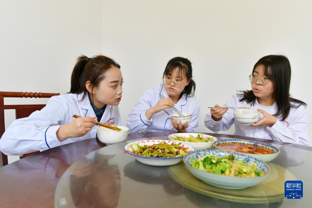 在武都區桔柑鎮衛生院,李瑞(左一)午餐時(shí)間了解新入職同事生活情況(5月11日攝)。