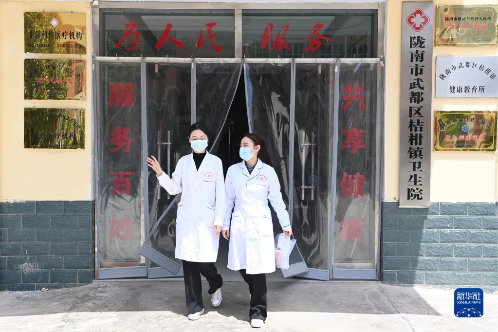 在武都區桔柑鎮衛生院,李瑞(右)外出前往出院患者家中回訪(fǎng)(5月11日攝)。