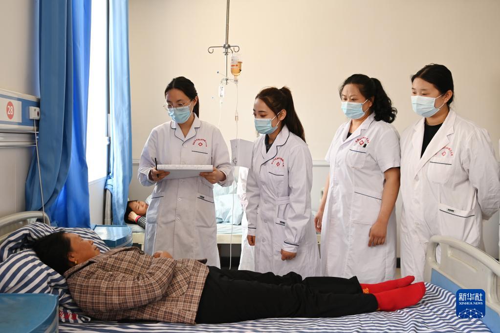 在武都區桔柑鎮衛生院,李瑞(左二)和同事們一起例行查房(5月11日攝)。