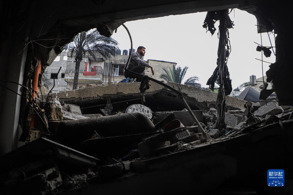 5月11日,在加沙地帶拜特拉希亞,一名男子檢查空襲后的自家房屋廢墟。