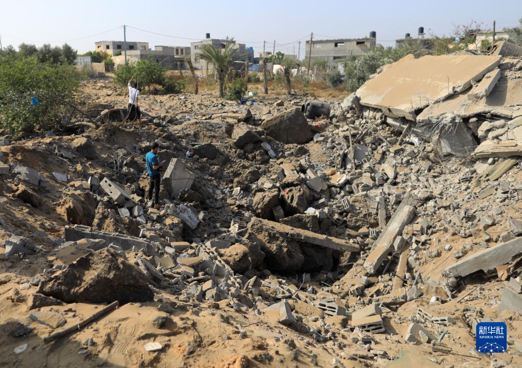 5月11日,在加沙地帶汗尤尼斯,巴勒斯坦人查看空襲過(guò)后的建筑廢墟。