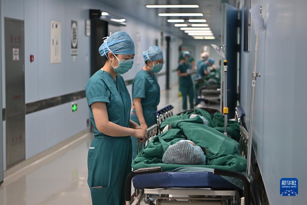 5月11日7時(shí)許,北京協(xié)和醫院手術(shù)室護士劉佳興(左一)在患者等候區與患者交流,了解患者情況,并安撫患者情緒。