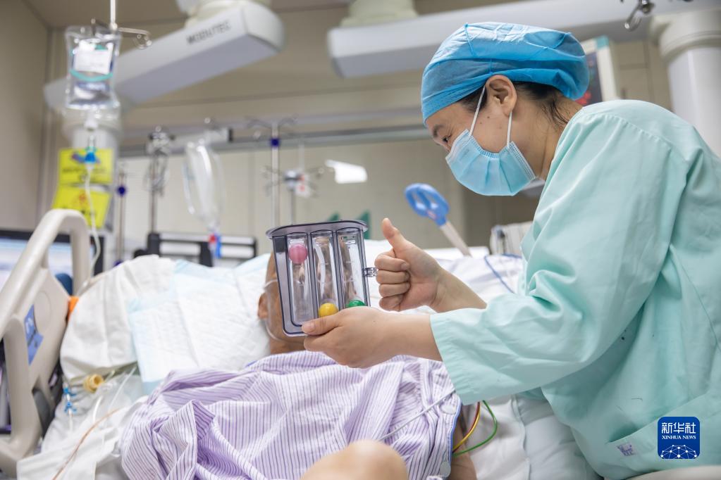 5月10日14時(shí)許,北京協(xié)和醫院重癥醫學(xué)科(ICU)護士劉艷妍為病人進(jìn)行呼吸功能訓練。