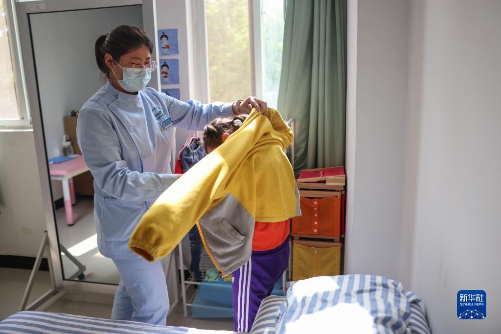 5月11日,康復治療師在渭南腦病康復醫院幫助患兒進(jìn)行生活自理訓練。