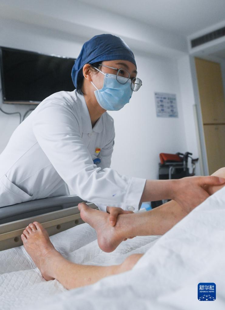 5月11日,浙江醫院醫療照護病房的護士在病房?jì)葹榕P床患者進(jìn)行日常手足護理。