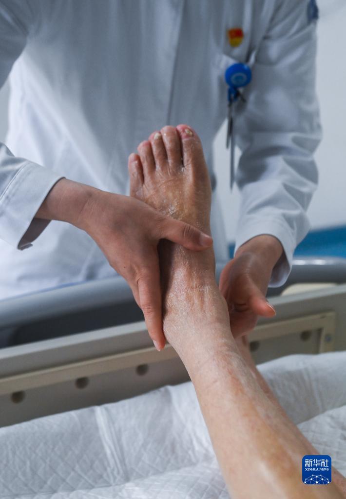 5月11日,浙江醫院醫療照護病房的護士在病房?jì)葹榕P床患者進(jìn)行日常手足護理。