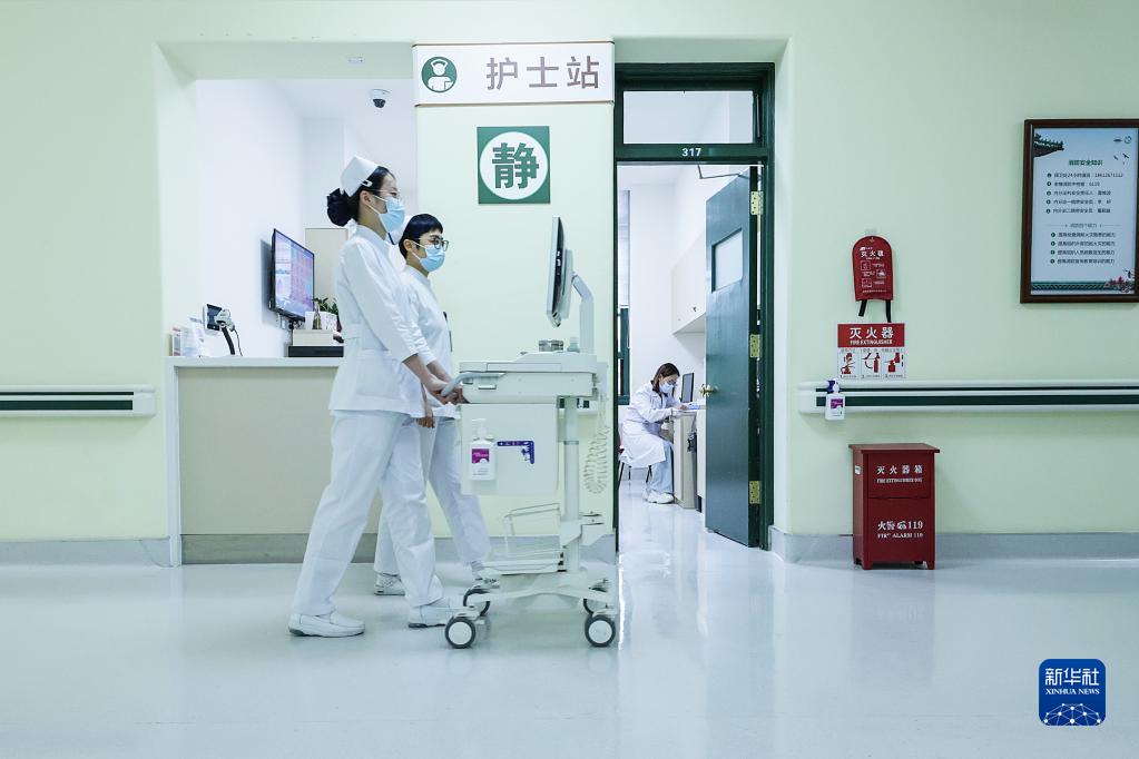 5月9日18時(shí)許,北京協(xié)和醫院內分泌科護士李蕊(右)與護理學(xué)院學(xué)生推著(zhù)移動(dòng)護理車(chē)走過(guò)病房。