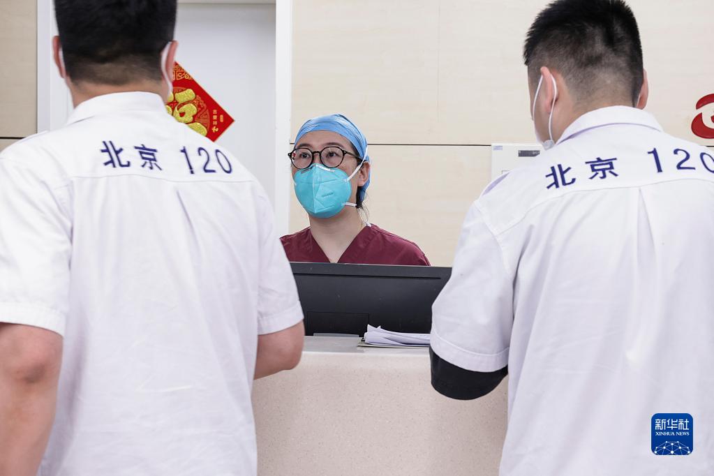 5月9日22時(shí)許,北京協(xié)和醫院急診科護士王晶晶在分診臺與急救中心工作人員溝通。