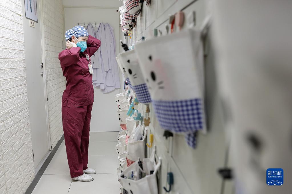 5月9日22時(shí)許,北京協(xié)和醫院急診搶救室護士朱槿在休息區整理帽子,做交班前準備。