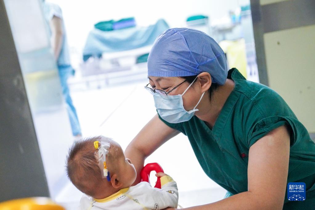 王曉杰在手術(shù)室內安撫患兒(5月10日攝)。