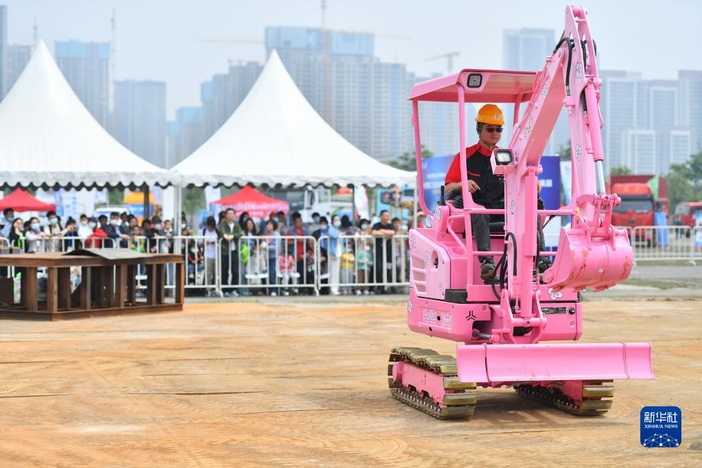 5月12日,觀(guān)眾在長(cháng)沙國際工程機械展覽會(huì )室外展區觀(guān)看微型挖掘機表演。