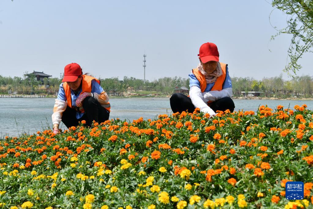 5月12日,工人在滄州園博園內養護花卉。
