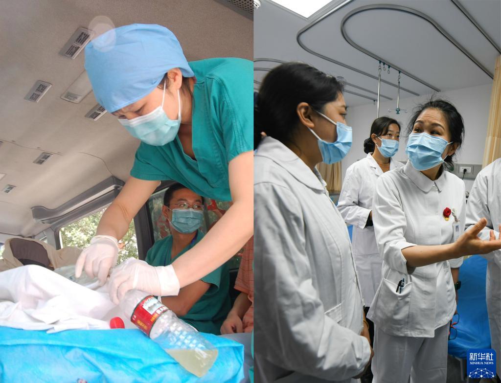 拼版照片:左圖是北京大學(xué)第一醫院主管護師曲海望(前)在成都雙流機場(chǎng)轉運傷員途中為傷員護理(2008年5月30日攝,新華社發(fā));右圖是曲海望(右)和汶川縣中醫醫院急診科的護士交流(2023年5月9日新華社記者王曦攝)。