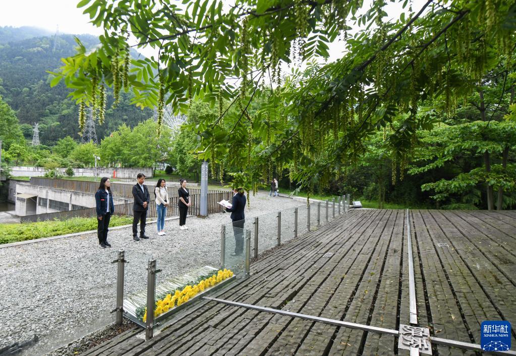 5月8日,鐘朝輝(左二)和曲海望(左三)在“5·12”汶川特大地震映秀震中紀念館外聆聽(tīng)邱光華機組英雄事跡微黨課。
