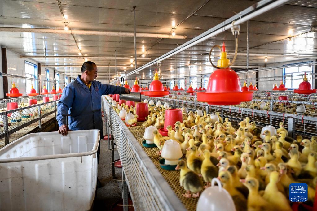 5月12日,阿榮旗全順大鵝養殖專(zhuān)業(yè)合作社工人給鵝雛喂食。