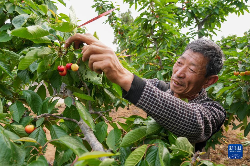 5月12日,五峰山街道西石村黨員董德常在自家黨員種植示范園內查看新品種櫻桃生長(cháng)情況。