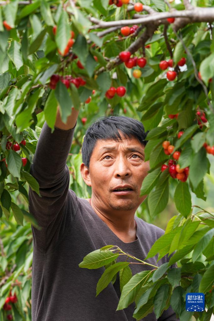 5月12日,五峰山街道紙坊村黨支部書(shū)記邢念勇在自家黨員種植示范園內采摘櫻桃。