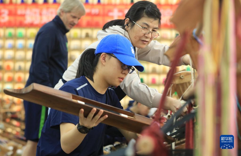 5月12日,來(lái)自上海包玉剛實(shí)驗學(xué)校的學(xué)生在張家界市武陵源區乖幺妹土家族織錦基地學(xué)習體驗土家族織錦非遺技藝。