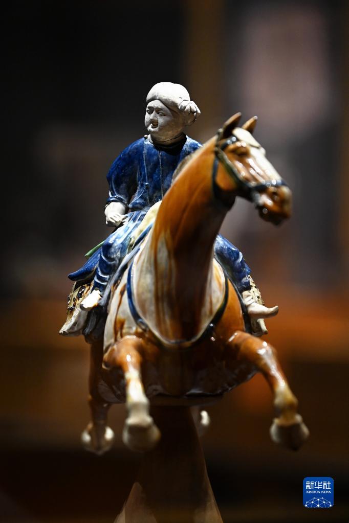 這是在西安博物院展出的唐代三彩騰空馬(5月8日攝)。飛騰的三彩馬上騎有一胡俑,真實(shí)再現了絲綢之路上西域胡人急奔長(cháng)安的生動(dòng)形象。