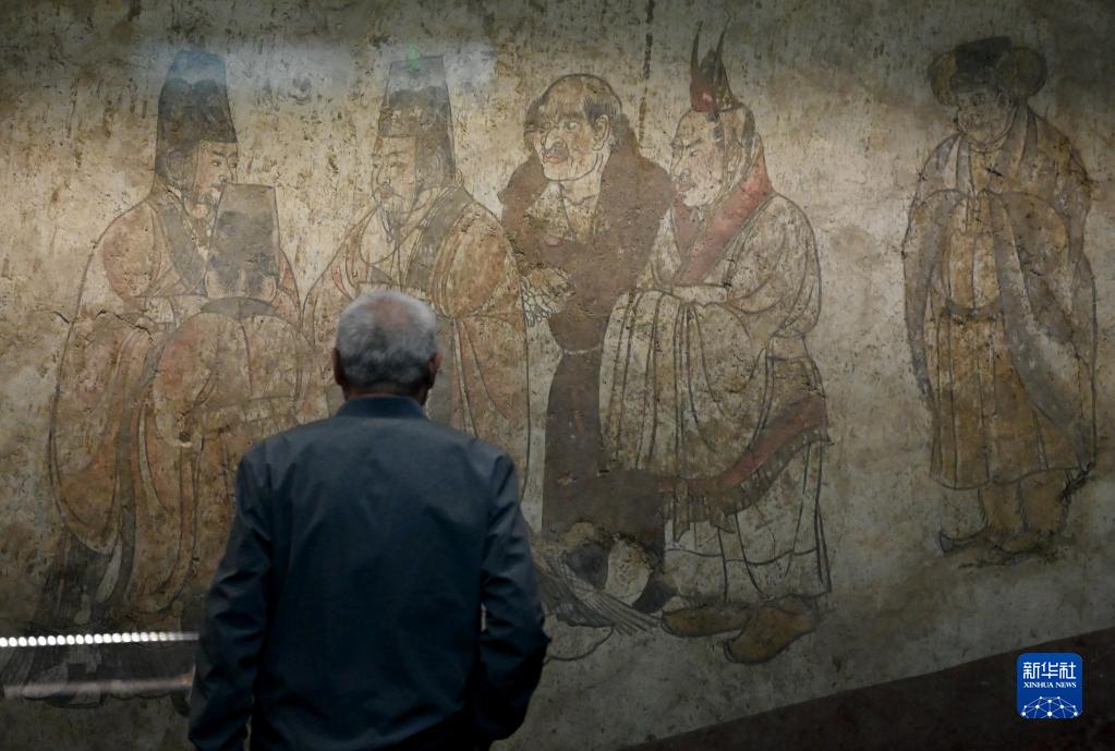 5月11日,游客在陜西歷史博物館內觀(guān)看唐章懷太子墓《客使圖》?!犊褪箞D》描繪的是唐代外交機構鴻臚寺官員接待外國使節的場(chǎng)景。