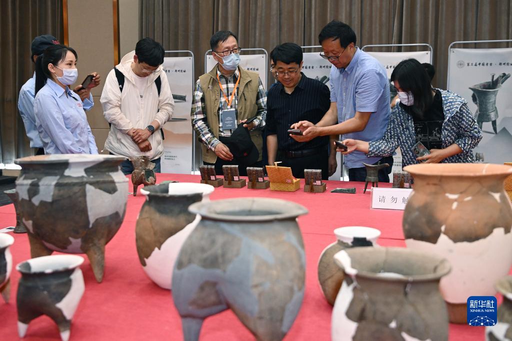5月13日,與會(huì )專(zhuān)家學(xué)者在鄭州書(shū)院街遺址臨時(shí)文物展廳參觀(guān)出土文物。