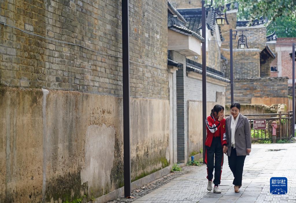 在江西省贛州市南康區盧屋村,“童伴媽媽”盧婕(右)陪留守兒童張婷散步(4月26日攝)。張婷父母離異并在外務(wù)工,她從小跟著(zhù)爺爺奶奶長(cháng)大。盧婕試著(zhù)和她做朋友,在生活上、學(xué)習上關(guān)心她。
