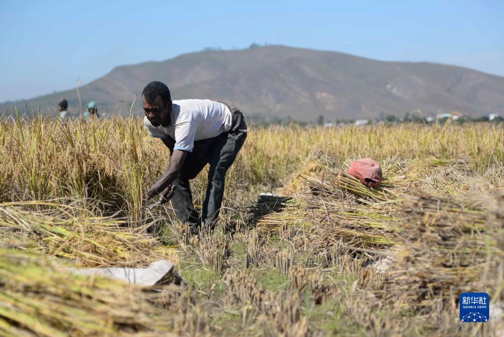 5月12日,在馬達加斯加首都塔那那利佛附近馬希奇鎮的中國國家雜交水稻工程技術(shù)研究中心非洲分中心,當地農民在雜交水稻高產(chǎn)示范田內收割水稻。