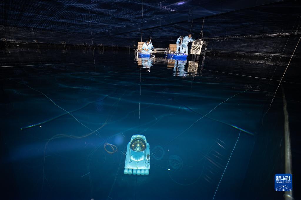 工作人員在高海拔宇宙線(xiàn)觀(guān)測站“拉索”的水切倫科夫探測器陣列水池里更換實(shí)驗設備(4月21日攝)。