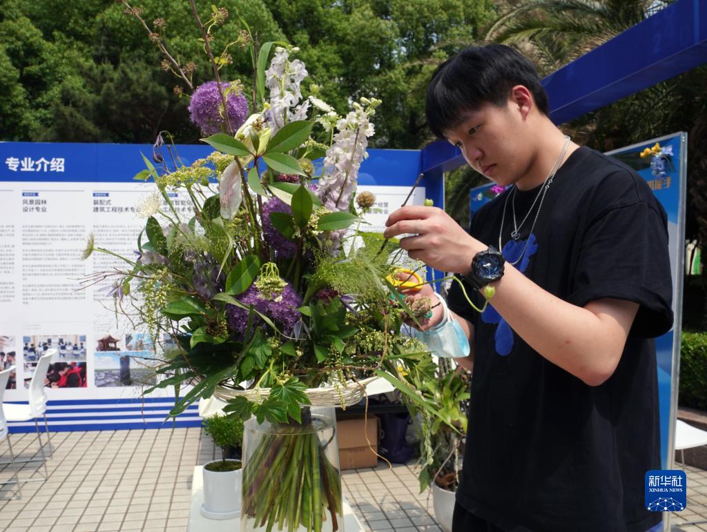 5月13日,上海城建職業(yè)學(xué)院的學(xué)生現場(chǎng)展示插花作品。