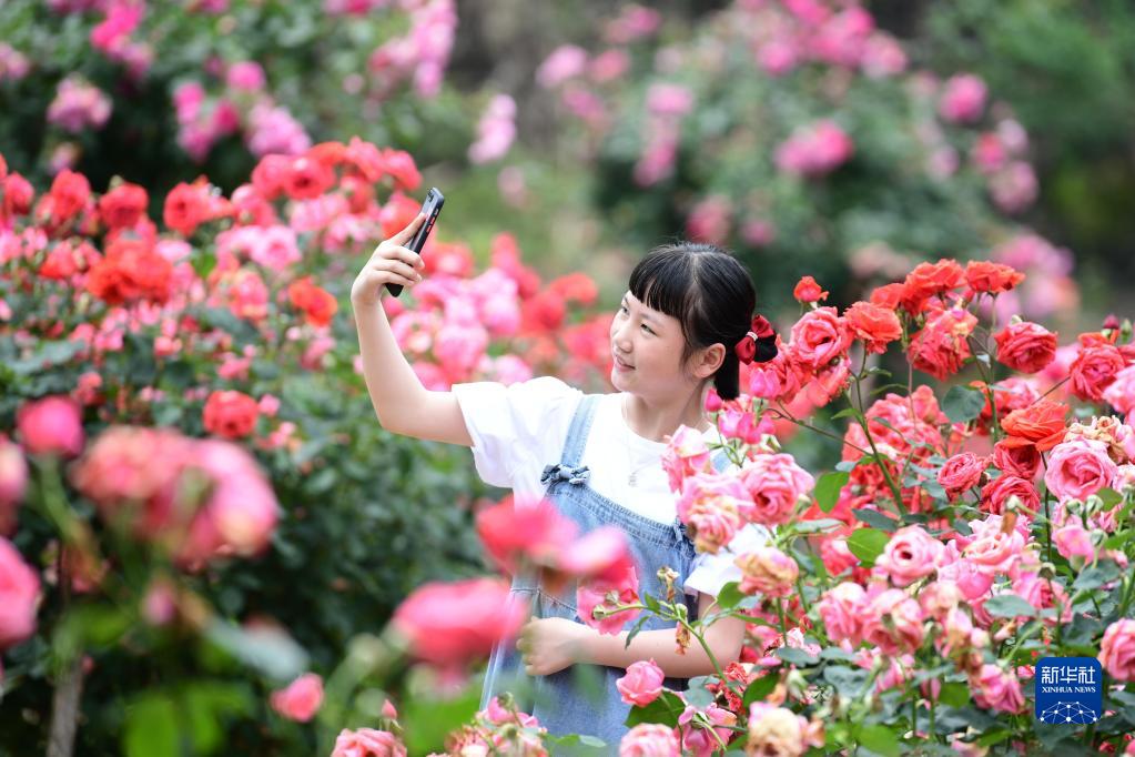 5月13日,一名女孩在貴州省黔東南苗族侗族自治州黃平縣舊州鎮東門(mén)村花卉基地賞花游玩。