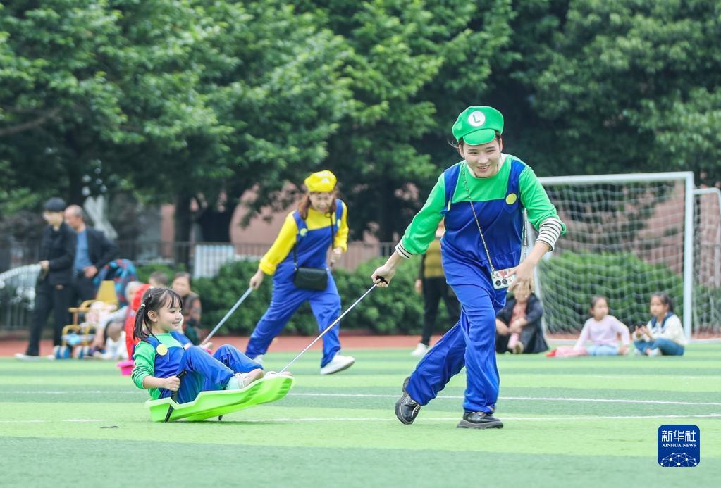 5月13日,在湖南省永州市藍山縣一幼兒園開(kāi)展的親子活動(dòng)上,小朋友和媽媽在操場(chǎng)上做游戲。