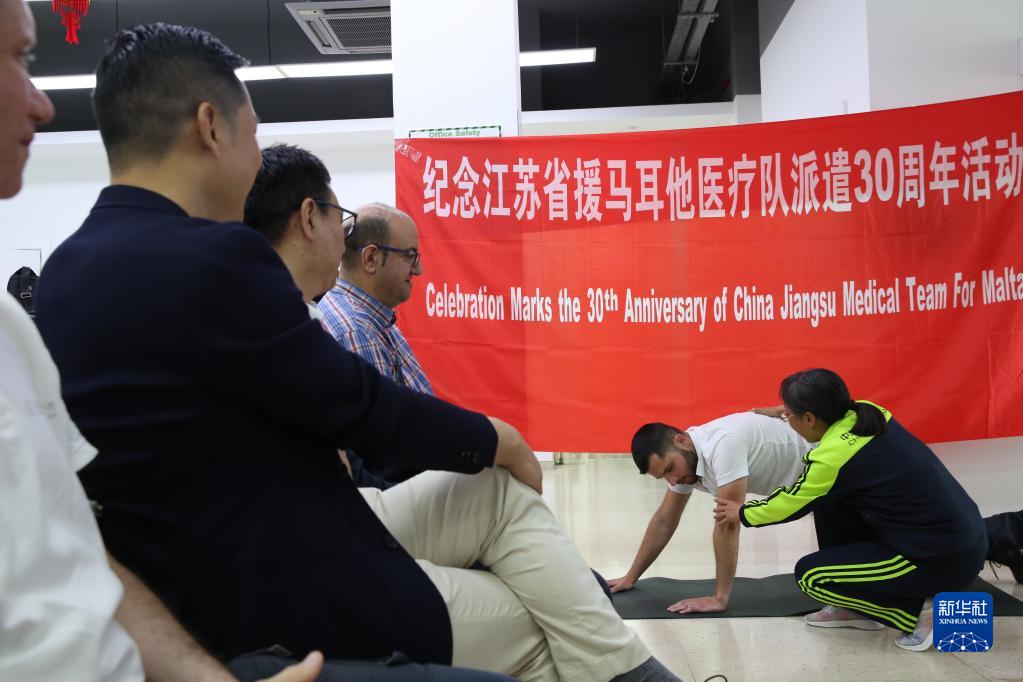 5月12日,在馬耳他馬爾薩什洛克,中國第18期援馬耳他醫療隊隊員邢雪梅在一名員工的幫助下演示頸腰痛康復治療的訓練動(dòng)作。