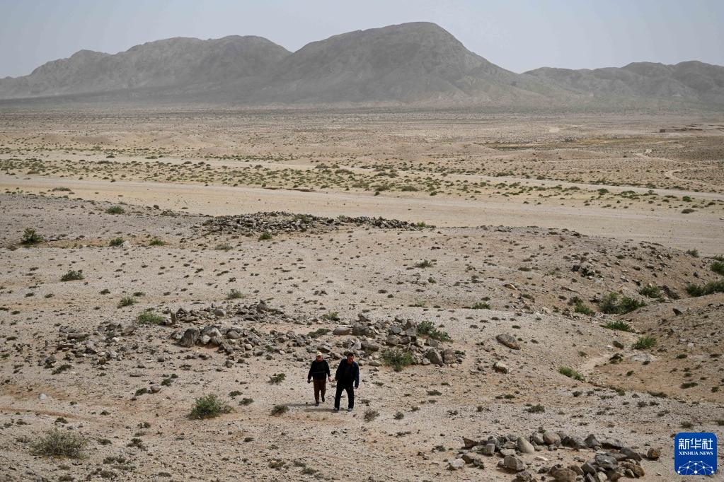 5月13日,駝峰(長(cháng)城)文物保護隊員許繼龍(右)和烏仁其其格在巡查阿拉善左旗一處石圈遺址。