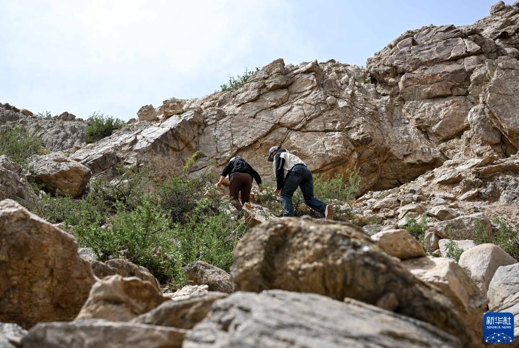 5月13日,為了巡查一處位于山頂上的烽火臺遺址,駝峰(長(cháng)城)文物保護隊員在山中跋涉。