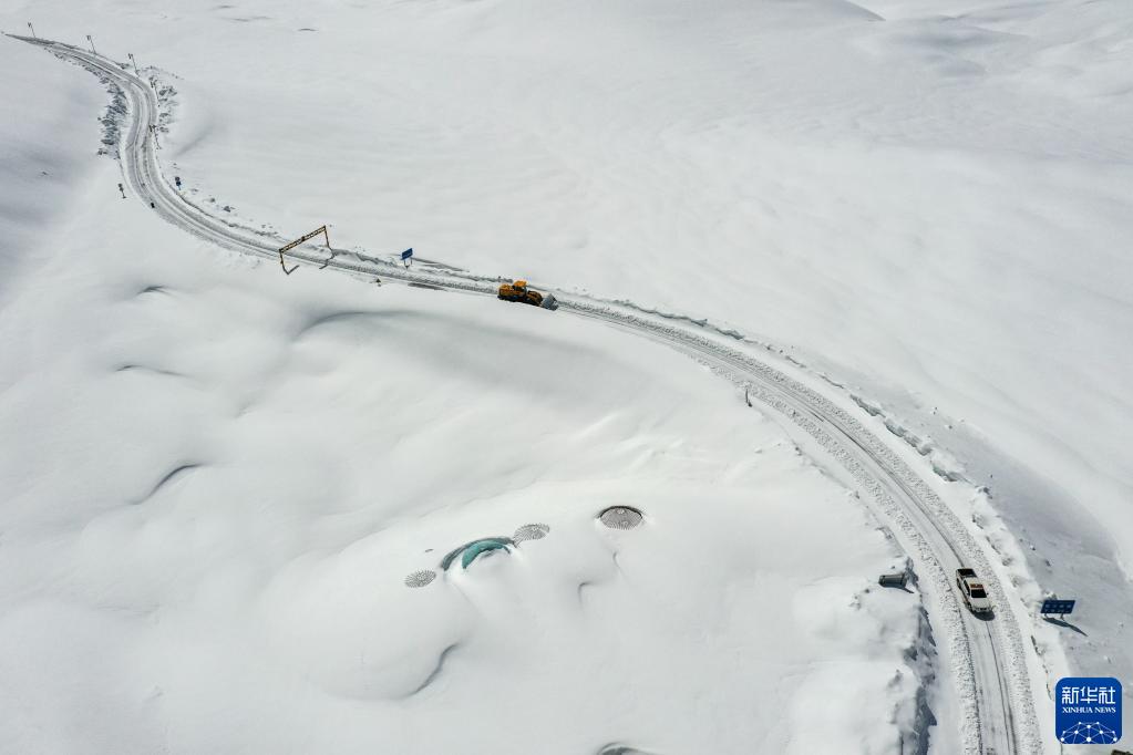 新疆奎屯公路管理局獨山子分局烏蘭薩德克養護站的工人駕駛車(chē)輛在獨庫公路上進(jìn)行清雪、養護作業(yè)(5月10日攝,無(wú)人機照片)。