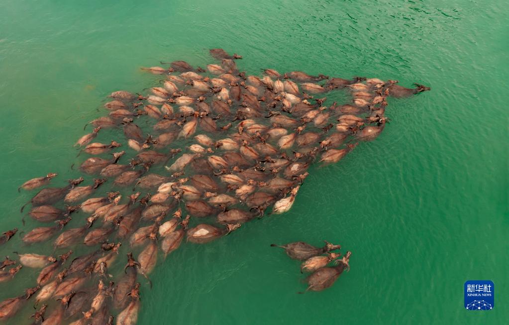 5月13日,在南充市蓬安縣相如鎮油房溝村嘉陵江段,成群結隊的水牛渡江(無(wú)人機照片)。
