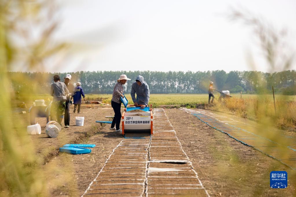 5月14日,江蘇省南京市六合區錢(qián)倉村的農民在田間使用機械設備進(jìn)行水稻育秧。