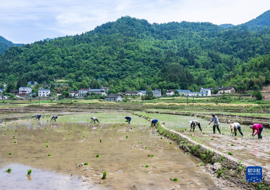 初夏時(shí)節,各地稻田里一派忙碌的景象,農民們搶抓農時(shí),移栽秧苗、育秧插秧。新華社發(fā)(鄭家裕攝)