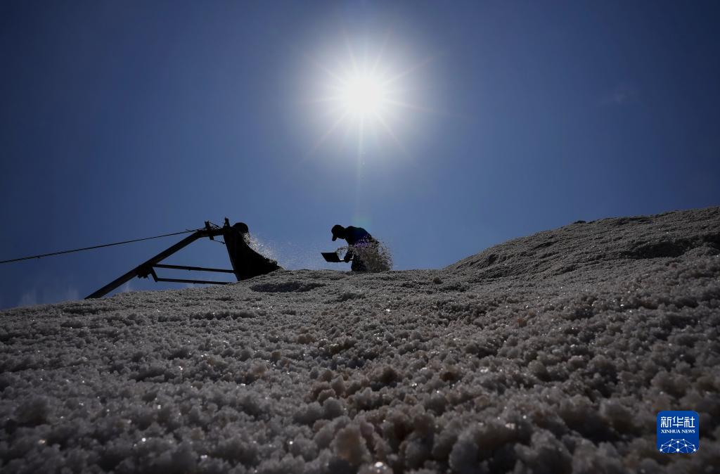 5月14日,唐山市曹妃甸區南堡鹽場(chǎng)的工人在整理春鹽。