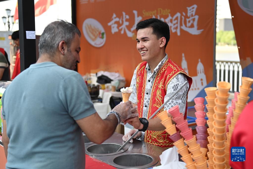 5月15日,游客在現場(chǎng)品嘗土耳其冰淇淋。