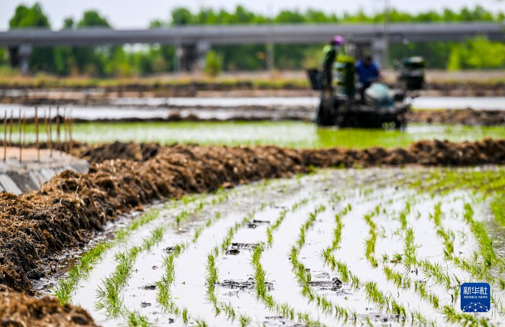5月15日,農民駕駛插秧機在興安盟烏蘭浩特市的水稻田中插秧。