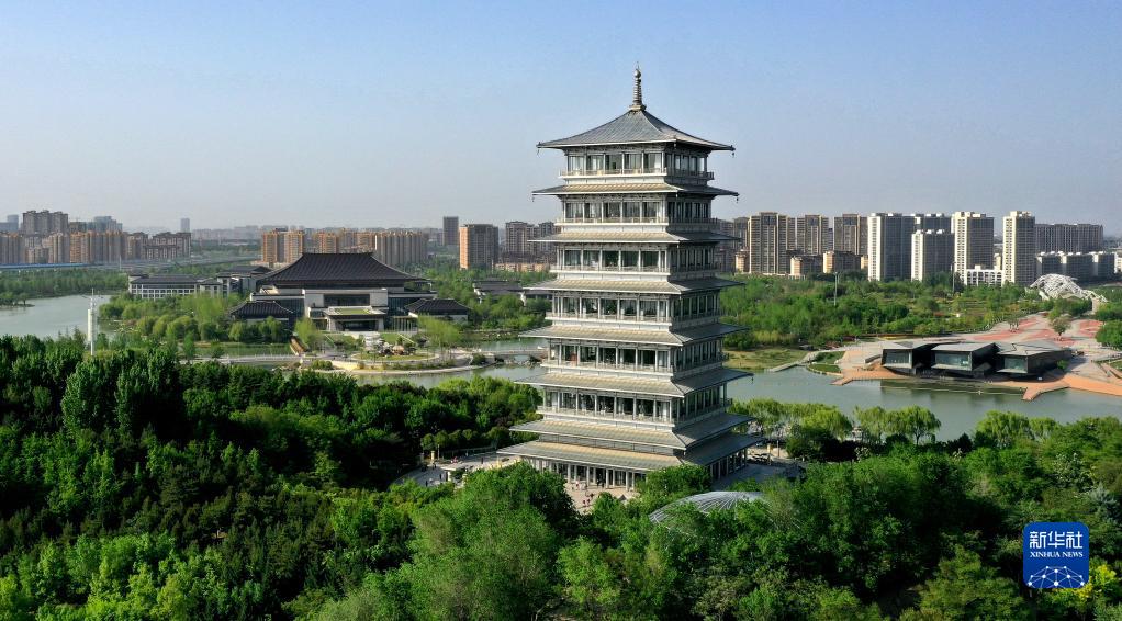 位于西安浐灞生態(tài)區的長(cháng)安塔(5月1日攝,無(wú)人機照片)。