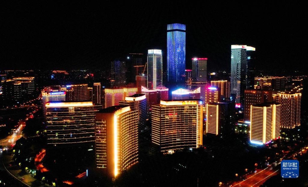 西安高新區都市之門(mén)區域夜景(4月30日攝,無(wú)人機照片)。