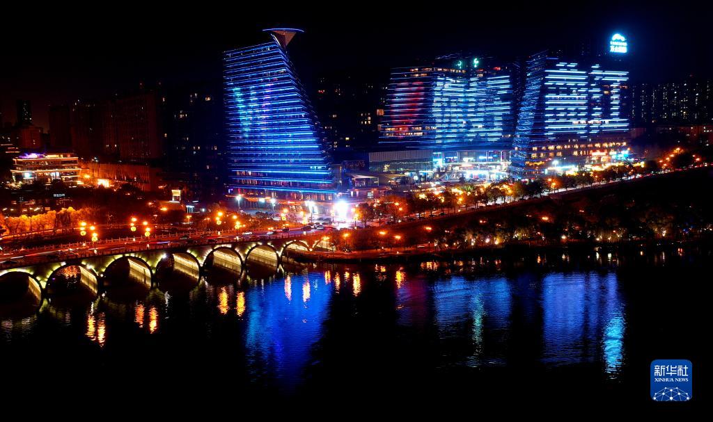 西安曲江南湖夜景(4月19日攝,無(wú)人機照片)。
