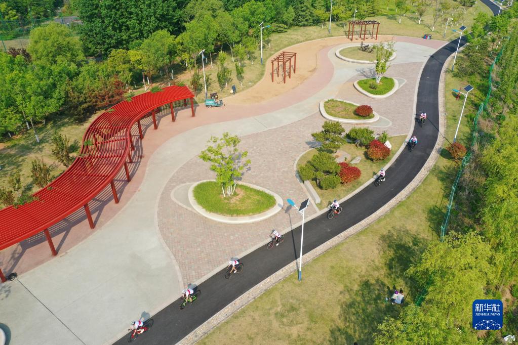 5月14日,市民在青島市即墨區環(huán)秀街道一個(gè)公園騎行(無(wú)人機照片)。