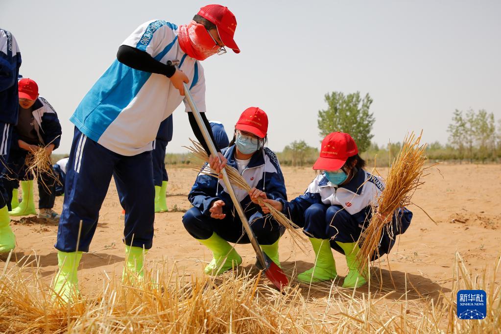 5月14日,學(xué)生在中衛市沙坡頭區扎麥草方格。