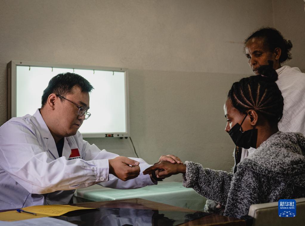 5月9日,在厄立特里亞首都阿斯馬拉的哈利貝特醫院,醫療隊脊柱外科醫生周大凱(左)為患者做檢查。