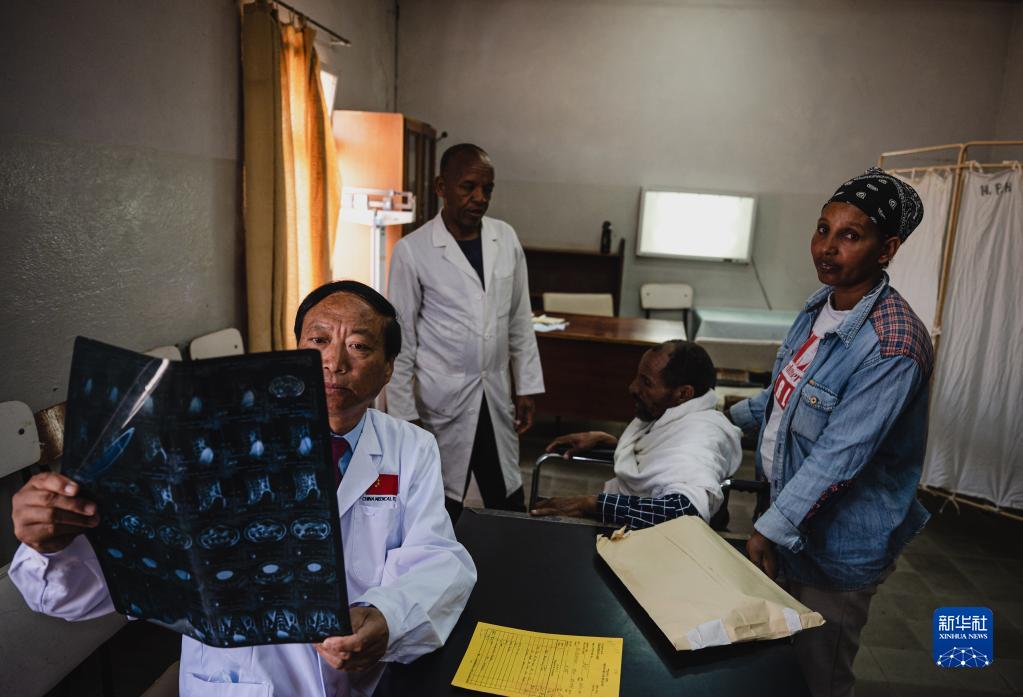 5月9日,在厄立特里亞首都阿斯馬拉的哈利貝特醫院,醫療隊隊長(cháng)、脊柱外科醫生朱振軍(前)為患者做檢查。