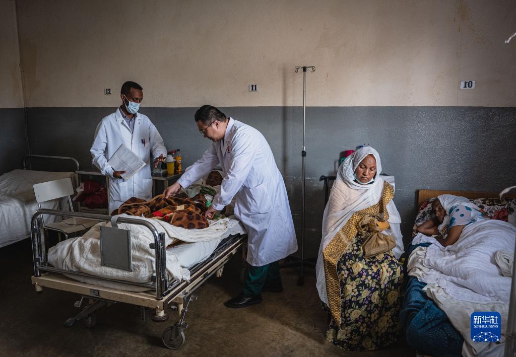 5月9日,在厄立特里亞首都阿斯馬拉的哈利貝特醫院,醫療隊普外科醫生邢宏彬(中)為患者做檢查。